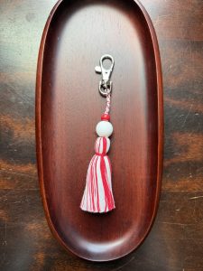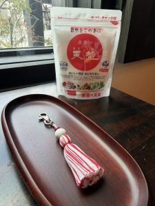 そして、今回は東浜の同じグループ会社の目玉商品である『天塩』の天塩レッド×塩の白色の組み合わせの糸合わせチャームを制作しました。