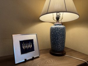 お選びいただいたのは「三本の矢」と「鳳凰の羽」の緞通です。鳳凰の羽と三本の矢は異なるデザインの緞通ですが、同じ額縁に収めることで、自然とまとまりが生まれます。